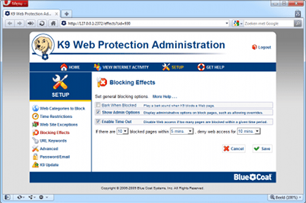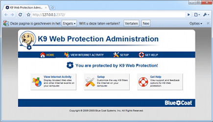 K9 Web Protection is een gratis programma voor webfiltering van Blue Coat, dat voornamelijk beveiligingsproducten voor bedrijven maakt. Het product is volledig Engelstalig maar de filtering is duidelijk van hoge kwaliteit en ook geschikt voor het Nederlandse taalgebied. Jammer is wel dat maar één profiel is toegestaan en dit dus voor alle computergebruikers geldt. Andere functies voor ouderlijk toezicht zoals controle van chat en beperking van computergebruik ontbreken. Een geweigerde site voordragen voor de witte lijst (van toegestane sites) is mogelijk, maar alleen bij Blue Coat zelf. Een optie die ook in andere programma’s niet zou misstaan is dat bij teveel geblokkeerde websites binnen een bepaalde periode, internettoegang voor enige tijd helemaal wordt geblokkeerd.