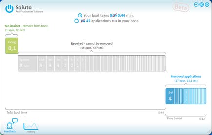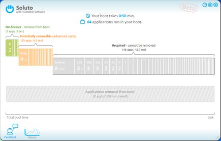 Na de installatie van Soluto en een eerste herstart krijgt u in de linkeronderkant te zien hoe lang het booten bij u duurde. Klikt u hierop, dan krijgt u te zien waarom. De gestarte programma’s worden heel overzichtelijk getoond in drie klassen: No-brainer (die kunt u zonder problemen verwijderen), Potentially removable (die kunt u verwijderen als u zeker weet dat u ze niet nodig hebt), en Required (basiscomponenten van Windows die u niet kunt verwijderen zonder problemen te introduceren, Soluto laat dit dan ook niet toe).