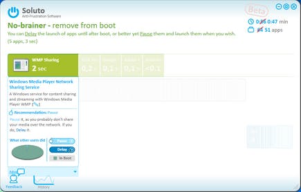 Let wel op: Soluto zelf was in ons geval ook voor iets meer dan 4 seconden opstarttijd verantwoordelijk, en dit is één van de programma’s die u niet kunt verwijderen. Maakt u de installatie van Soluto immers ongedaan, dan worden terug alle originele programma’s tijdens het booten opgestart. Dat is dan ook het enige nadeel aan dit programma: het voert zijn taak uitstekend uit, maar zorgt er dan wel voor dat u ervan afhankelijk blijft als u uw snelle computer wil behouden.