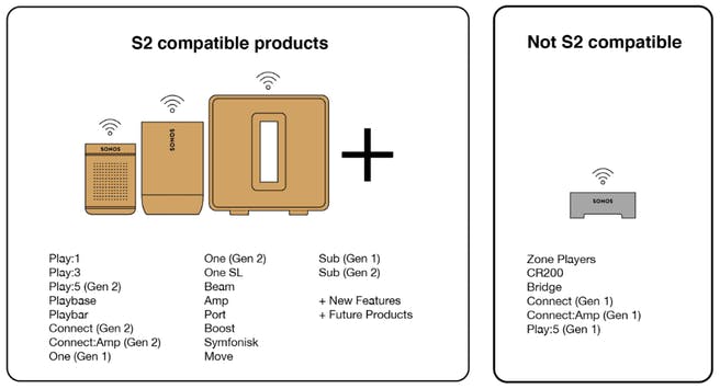 Sonos-producten die vanaf nu uitkomen, werken exclusief via de nieuwe Controller-app. De huidige app blijft voorlopig bestaan en zal hernoemd worden naar de S1 Controller-app. Wie de bestaande app gebruikt, krijgt 8 juni een seintje dat de nieuwe beschikbaar is. Op de onderstaande afbeelding zie je welke bestaande Sonos-producten werken met de nieuwe app.