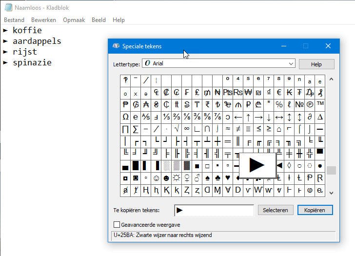 Om een teken in te voegen klik je op een gewenst exemplaar. Klik vervolgens op Selecteren en dan op Kopiëren. Plak via bijvoorbeeld Control-V het teken vervolgens in het gewenste programma. Veel lettertypen (maar niet alle, kwestie van proberen) worden ondersteund in het Kladblok. Zo kan je met bulletpoints opvallende lijstjes maken. Bijvoorbeeld een boodschappenlijst waar je belangrijke items markeert met een speciaal teken. Het is overigens mogelijk om meer dan één speciaal teken tegelijk te kopiëren. Selecteer daarvoor simpelweg een volgend teken en klik op Selecteren. Pas nadat je alle tekens klaar hebt gezet klik je op Kopiëren, waarna de hele reeks in een keer is te plakken.