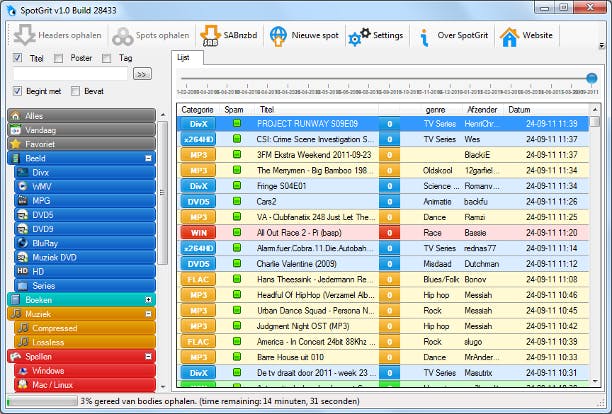 U plaatst spammers eenvoudig op een zwarte lijst. Deze lijsten wisselt u eventueel uit met andere gebruikers, want exporteren en importeren is mogelijk. Handig is ook de optie om spots van spammers te verwijderen die door andere gebruikers meermaals op zwarte lijsten zijn gezet. Op die manier werkt u samen aan een schone database. Spots die bijvoorbeeld vaker dan tien keer zijn gerapporteerd, gooit het programma weg. Een leuke toevoeging is de tijdbalk, waarmee u snel oude spots filtert. De algemene indruk van dit zoek- en downloadprogramma is positief. De interface is gebruiksvriendelijk en aanpasbaar via verschillende skins. Bovendien bevalt de bediening erg goed. Vooral de snelle navigatie tussen diverse categorieën is een groot pluspunt ten opzichte van Spotnet. Als u lekker wilt bladeren door het aanbod, hoeft u niet steeds te wachten. Downloadtaken handelt het betrouwbare usenetprogramma SABnzbd voor u af. Alle functies van SABnzbd zijn bereikbaar in een apart tabblad. Samenvattend werkt SpotGrit iets prettiger dan Spotnet en wordt er druk aan de weg getimmerd door de ontwikkelaars. Gelukkig hoeft u niet telkens het programma opnieuw te installeren, want er is een automatische update-functie.