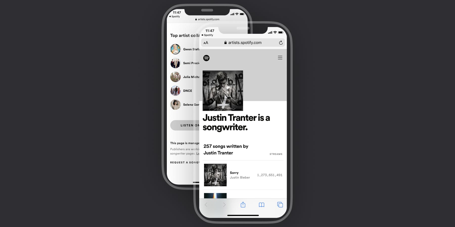 Hoewel je via de Spotify-app in de credits van een nummer kunt duiken, word je wel doorverwezen naar je browser als je een songwriter-pagina wilt bezoeken. Erg handig is dit nog niet. Voor de liedjesschrijvers zelf zal het vervelend zijn dat op hun songwriter-pagina niet een foto van henzelf te zien is, maar de cover van hun meest succesvolle nummers.