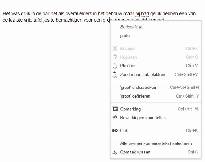 Spraakgestuurd typen in Google Docs heeft op dit moment geen manier om met de stem fouten te corrigeren. Je moet dus nog steeds de muis en het toetsenbord gebruiken om de verbeteringen in de tekst aan te brengen. Met de rechtermuisknop bekijk je uiteraard suggesties van de woorden die met stippellijntjes zijn gemarkeerd.
