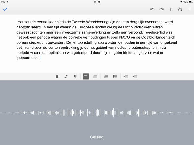 Google heeft op het vlak van spraaktechnologie altijd voorrang gegeven aan mobiele apparaten. In de iOS- en Android-versie werkt het spreaakgestuurd typen voortreffelijk. Je tikt in Google Docs op de microfoonknop aan de linkerkant van de spatiebalk en je spreekt op een normaal tempo tegen je mobiele toestel. De nauwkeurigheid van de mobiele versie is verbazend goed en de problemen met leestekens in het Nederlands zijn er niet, die worden gewoon ingevoerd. Het invoegen van tabellen wordt echter niet ondersteund in de iOS en Android-versie.