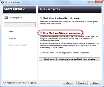 Via de Wizard Instellingen kunt u de opties van Start Menu 7 aanpassen.