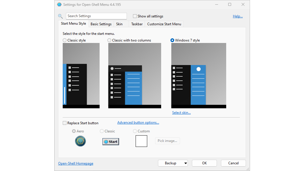Op de tab Start Menu Style kun je kiezen uit drie verschillende stijlen voor het startmenu: Classic style, Classic with two columns en Windows 7 style. De afbeelding eronder geeft een voorproefje. Kies hierna voor Select skin. Het bijbehorende tabblad opent. In het menu Skin kies je de gewenste stijl. Ben je in een nostalgische bui, dan kies je bijvoorbeeld voor Windows XP Luna of Windows 8. Liefhebbers van transparantie bekijken Full Glass. In de sectie Skin options bepaal je de detailinstellingen. Deze verschillen per gekozen skin. Zo kun je bij Full Glass de mate van doorzichtigheid instellen en bij Classic Skin een driedimensionale rand activeren.