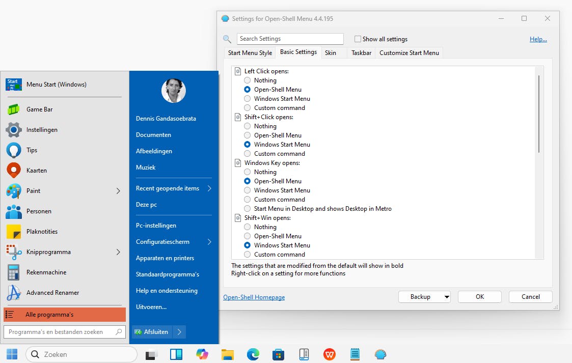 Open-Shell houdt er rekening mee dat je mogelijk soms het originele startmenu van Windows wilt openen. Klik op de tab Basic Settings. Hier kun je aangeven met welke toetscombinatie je alsnog het onaangepaste startmenu kunt openen, bijvoorbeeld via Shift-toets+Windows-toets. In plaats van een toetscombinatie kun je kiezen voor een muisklik, zodat je bijvoorbeeld het oude startmenu met een linkermuisklik opent.