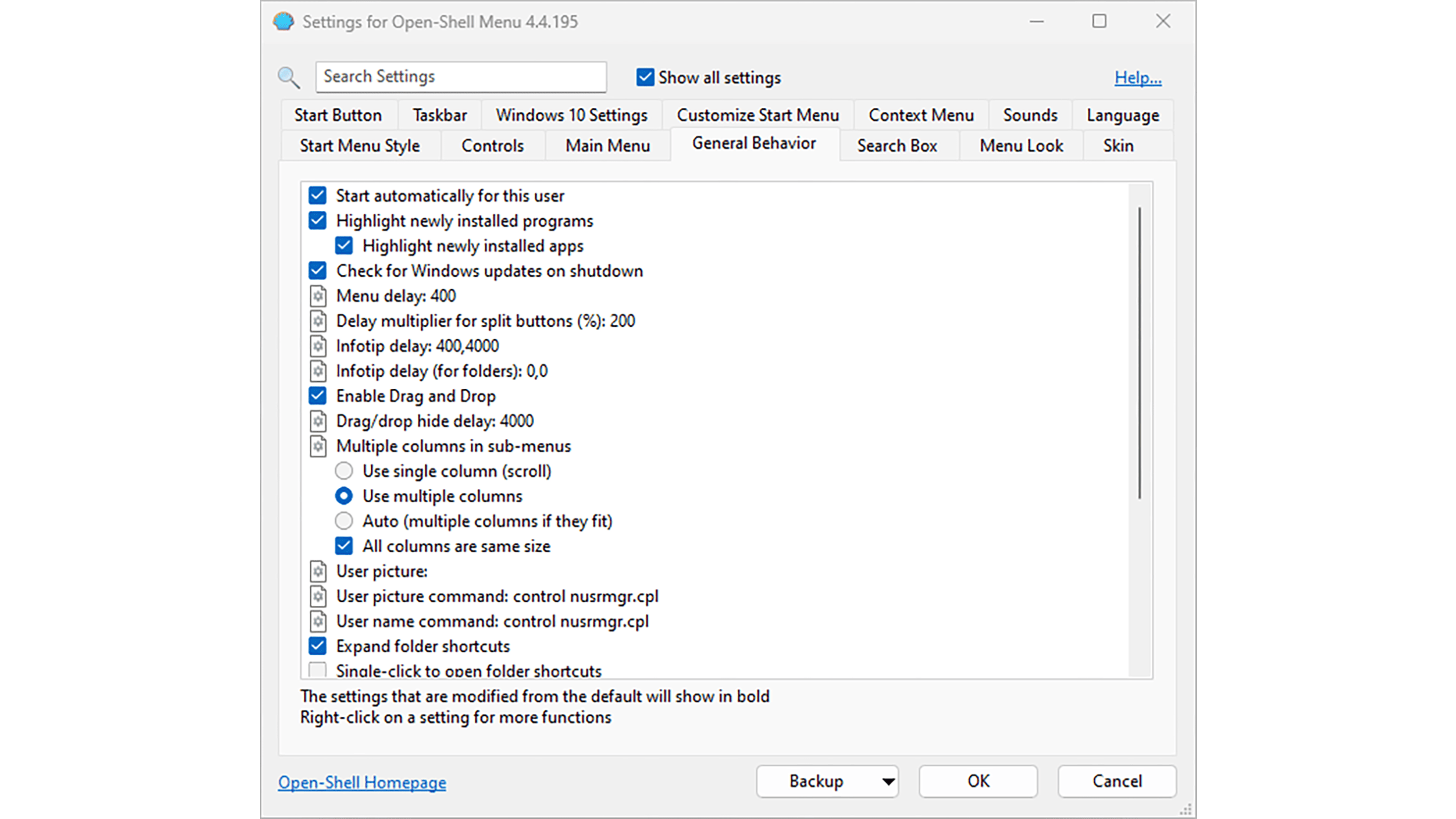 We hebben nu de basisinstellingen voor het startmenu aangepast, maar we zijn op zoek naar nog meer flexibiliteit. Standaard laat Open-Shell niet alle opties zien, terwijl we wél het onderste uit de kan willen. Plaats een vinkje bij Show all settings (boven in het venster). Open-Shell toont nu alle beschikbare tabbladen. We kijken eerst naar de tab General Behavior. In tegenstelling tot de titel van deze tab, bevat deze sectie juist ook geavanceerde instellingen waarmee je het startmenu verder aanpast. Via Menu delay bepaal je hoe snel het menu opent. Standaard is dit in 400 milliseconden. Ook kun je hier de gebruikersafbeelding in het menu openen (User picture) en pictogrammen alvast in een cache laden voor snellere weergave (Pre-cache icons).