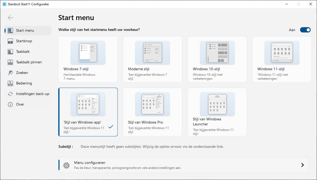 Klik op Startmenu voor een overzicht van beschikbare stijlen. Zo kun je onder meer kiezen voor Windows 10-stijl, waarbij het startmenu de bekende tegels uit Windows 10 krijgt. Een interessante optie is Stijl van Windows-app. Hierbij krijgt het startmenu flink wat ruimte voor apps en een aparte sectie waarin je alle apps vindt.