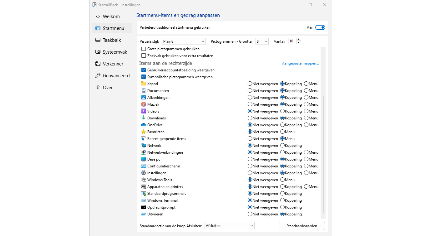 Bepaal hierna hoe het menu verder moet functioneren. De opties hiervoor vind je in de lijst eronder. Onder Alle programma’s geef je aan hoe de apps zichtbaar moeten zijn in het menu, bijvoorbeeld via een uitklapmenu zoals je mogelijk nog kent uit Windows XP. Verder is de sectie Items aan de rechterzijde interessant: hier kies je welke mappen in het startmenu worden opgenomen en of je ze bij het aanklikken direct wilt openen in een nieuw venster of liever eerst nog bekijkt in een menu. Schakel je de computer meestal niet uit, dan kun je de actie van de knop Afsluiten aanpassen via de gelijknamige optie onderin. Kies bijvoorbeeld voor Afmelden of Vergrendelen.