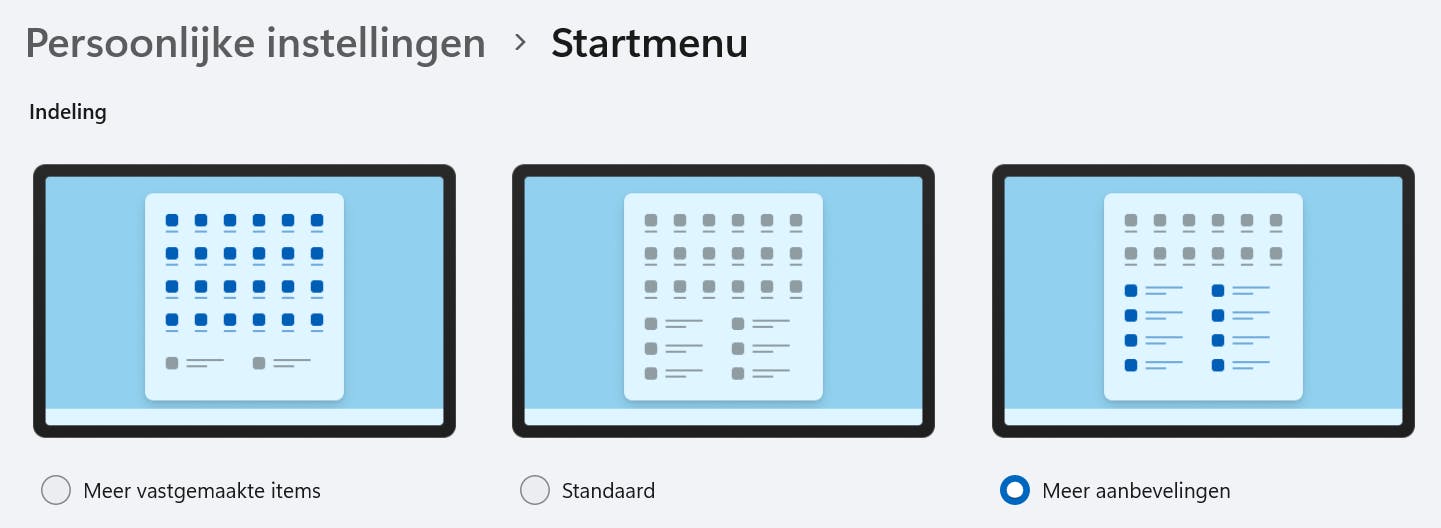 Eerlijk is eerlijk: het standaardstartmenu van Windows 11 biedt ook de nodige aanpassingsmogelijkheden die het bekijken waard zijn. Zorg dat je de nieuwste versie van Windows 11 gebruikt. Op het moment van schrijven is dit 24H2. Open het instellingenvenster (Windows-toets+I) en kies Persoonlijke instellingen, startmenu. Standaard reserveert het startmenu even veel ruimte voor vastgemaakte programma’s als voor recent gebruikte bestanden en programma’s (door Windows zelf ‘aanbevelingen’ genoemd). Je kunt deze verhouding zelf aanpassen via de opties bovenin: kies Meer vastgemaakte items als je de bovenste helft van het startmenu meer ruimte wilt geven of kies Meer aanbevelingen als je juist de lijst met recent gebruikte items belangrijker vindt.