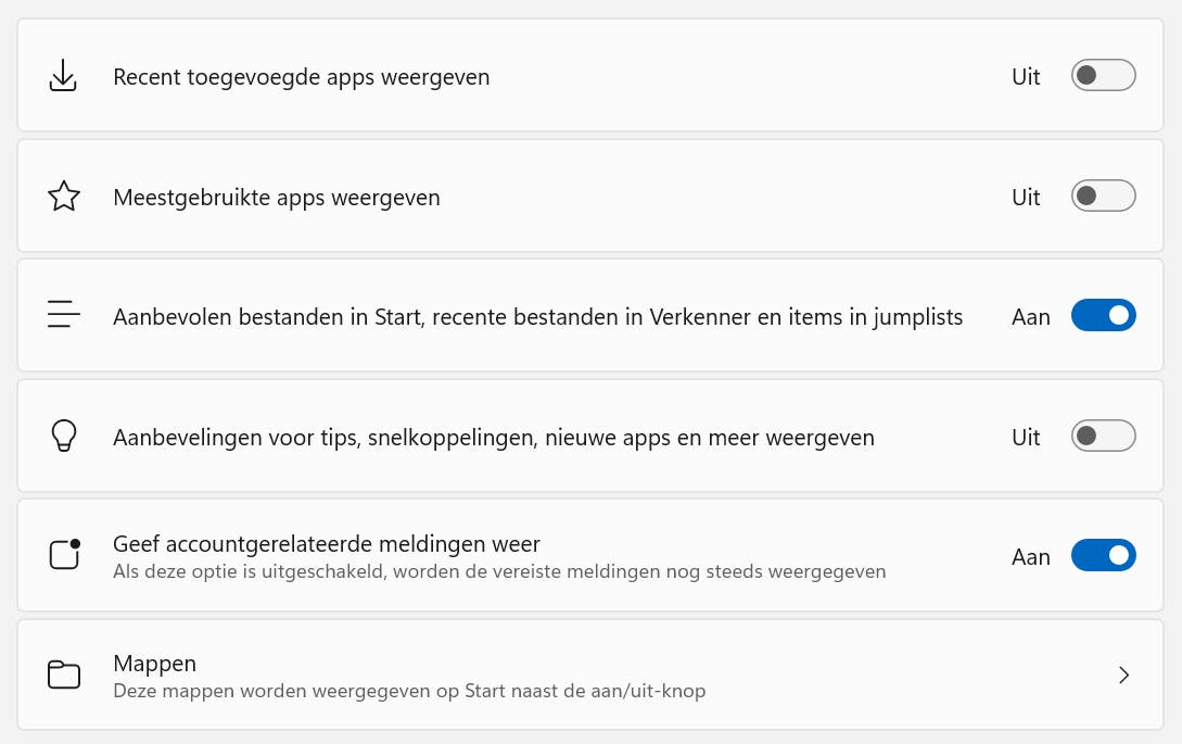 Naast de aan-uitknop van het startmenu kun je veelgebruikte mappen tonen, zodat je hier snel toegang toe hebt. In het instellingenmenu van het startmenu klik je op Mappen (onder in het venster). Een overzicht van beschikbare mappen verschijnt. Zet de schuif op Aan bij de mappen die je wilt toevoegen, bijvoorbeeld Documenten, Video’s en Persoonlijke map. Helaas kun je geen eigen mappen kiezen. Wil je niet dat Windows ongevraagd onderdelen toevoegt aan het startmenu, dan kun je de opties Recent toegevoegde apps weergeven en Meestgebruikte apps weergeven uitschakelen. Voorkom andere extra items door ook de optie uit te schakelen: Aanbevolen bestanden in Start, recente bestanden in Verkenner en items in jumplists.