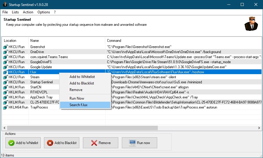 Deze lijst is helaas niet volledig, aangezien Startup Sentinel zich in principe alleen bezighoudt met zelfstartende toepassingen van derde partijen (die zich vooral in de registersleutel HKCU:Run bevinden). Windows-apps, processen en services tref je hier dus niet aan. Voor een complete lijst kijk je – als gevorderde gebruiker – wellicht beter uit naar een alternatief als AutoRuns.