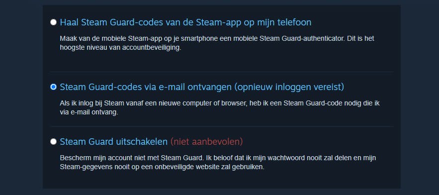 Zit dit er eenmaal op, dan is Steam Guard in te schakelen via hetzelfde menu. Je ziet dan de optie Steam Guard-accountbeveiliging beheren staan, met de keuze om de verificatiecodes te ontvangen via je e-mailadres of via de Steam-app. Die laatste optie spreekt verder voor zich, maar we staan graag nog wel even stil bij de app.