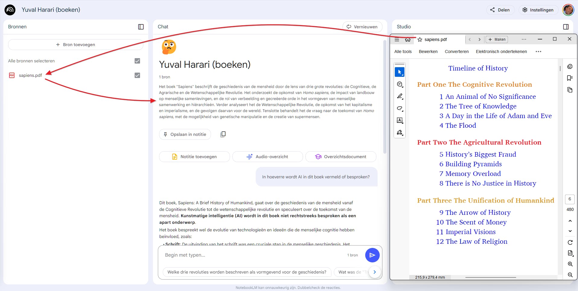 Ook anderstalige bronnen (rechts: een pdf in Adobe Reader) kun je meteen bestuderen en bevragen in je eigen taal.