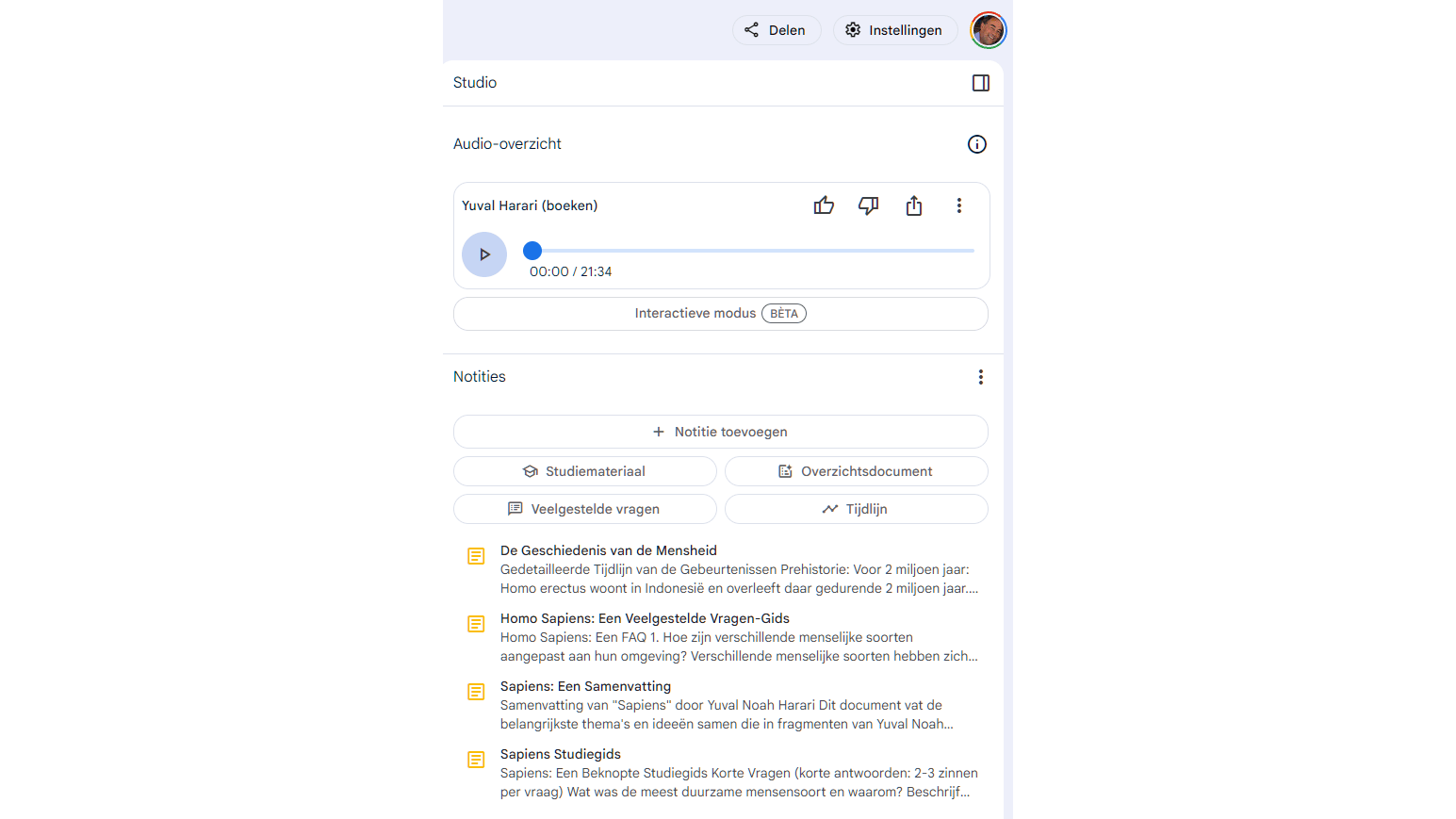 Audiobestanden worden automatisch intern getranscribeerd, zodat je er vragen over kunt stellen. Met de knop + Bron toevoegen voeg je meer bronnen toe aan een geselecteerd notebook. Met vinkjes bepaal je welke bronnen de dienst mag gebruiken bij vragen. Je kunt ook anderstalige documenten uploaden en in je voorkeurstaal, zoals Nederlands, vragen stellen en antwoorden ontvangen. De taalvoorkeur stel je in via de instellingen van je Google Account.