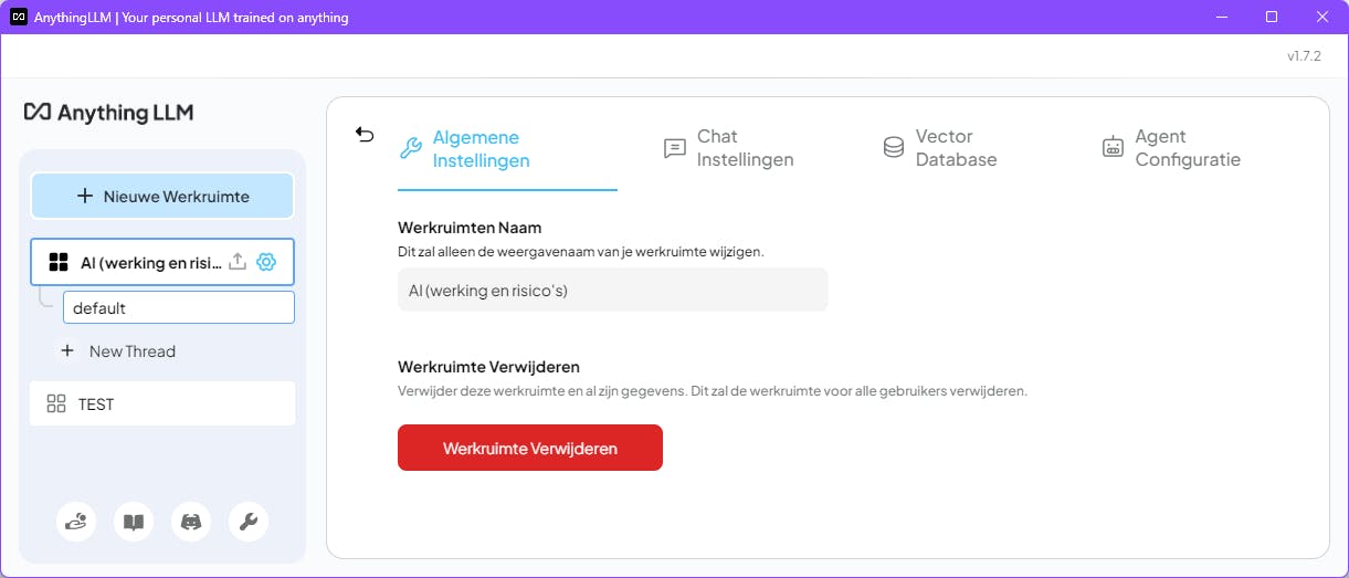 Klik op het tandwielpictogram bij een werkruimte. Op het tabblad Algemene instellingen kun je de naam wijzigen of de werkruimte verwijderen. Weet wel dat alles wat je embed in de vectordatabase van toegevoegde bronbestanden verdwijnt bij verwijdering. De bronbestanden zelf blijven behouden.