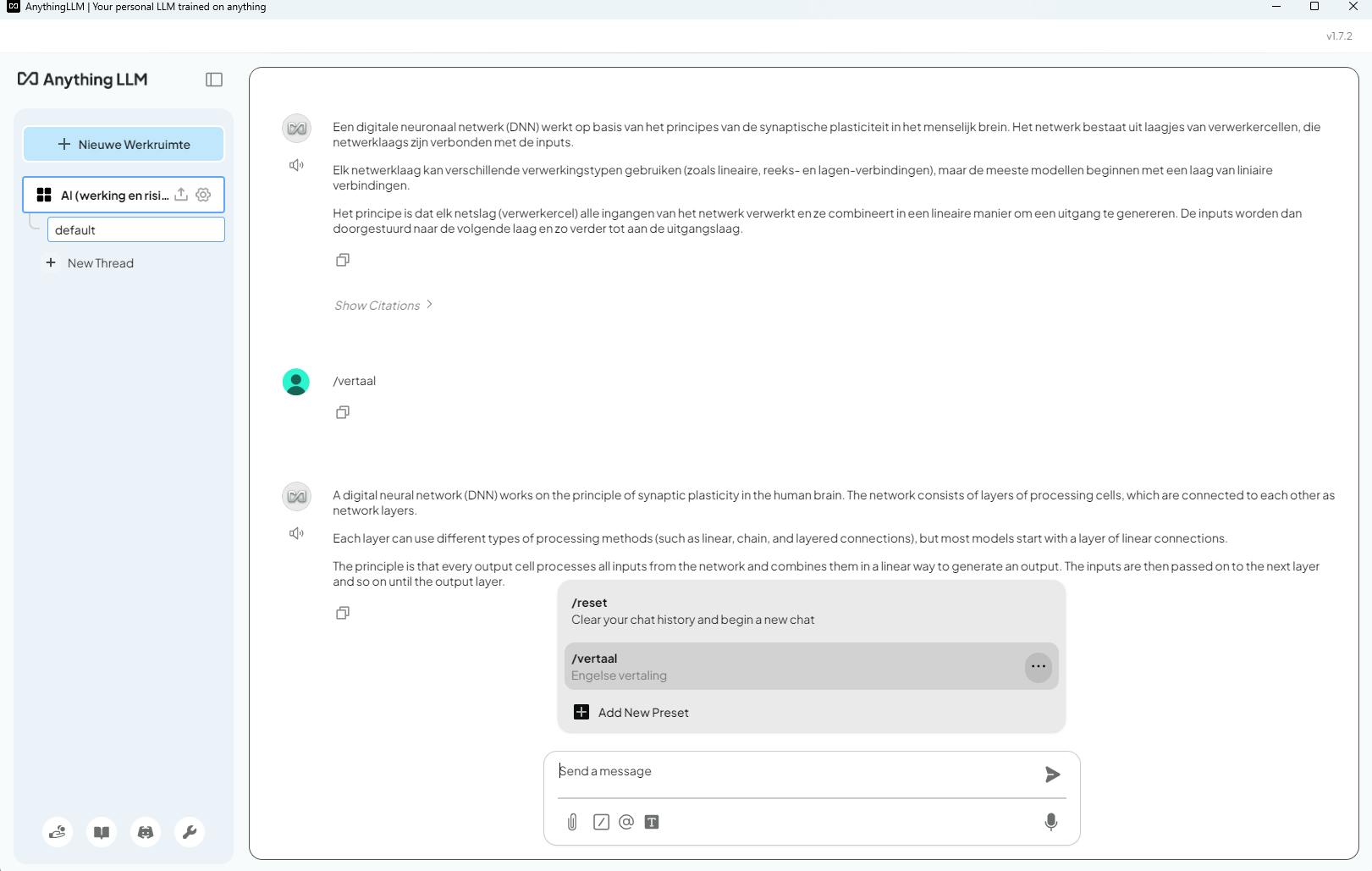 Daarnaast zie je een paperclip-pictogram voor het ad hoc uploaden van extra documenten en een pictogram voor slash-commando’s en agents. Het standaard beschikbare slash-commando is /reset, waarmee je je chatgeschiedenis wist en een nieuwe sessie start. Voeg via Add a New Preset eigen commando’s toe, zoals /vertaal met een prompt als ‘Vertaal het zojuist gegeven antwoord naar het Engels’ en Engelse vertaling als beschrijving. Deze commando’s komen automatisch ook beschikbaar in je andere threads en werkruimtes.