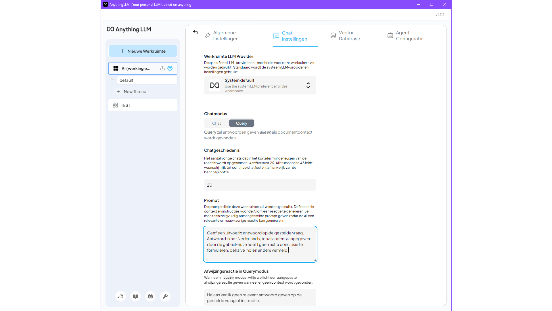 In het tabblad Chat Instellingen kies je een specifieke LLM Provider of stel je de Chatmodus in. Standaard staat dit op Chat, maar met de optie Query gebruikt het systeem uitsluitend je eigen documentcontext voor responses, zonder de getrainde dataset van de LLM te raadplegen. Hier bepaal je ook hoeveel eerdere chats worden meegenomen (standaard 20) en met welke achterliggende prompt de werkruimte rekening moet houden.