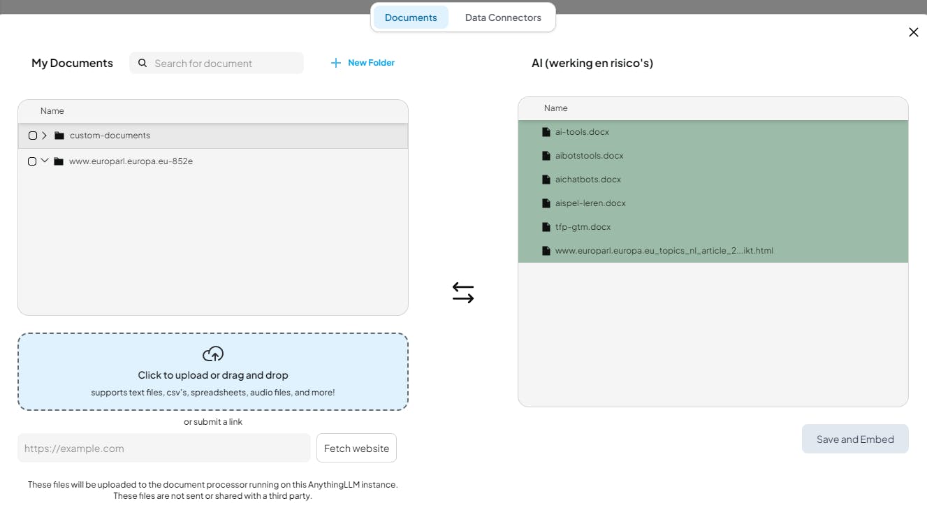 Je voegt bronbestanden als volgt aan je werkruimte toe. Klik vanuit het hoofdvenster op de uploadpijl naast de werkruimte. Er opent een dialoogvenster met twee knoppen: Documents en Data Connectors. Via Documents kun je diverse bestandstypes uploaden, zoals txt-, pdf-, csv- en xls(x)-bestanden, of ze direct verslepen naar het venster. Deze bestanden worden door de ingebouwde document-processor geanalyseerd (waarbij ze worden opgesplitst in brokken (chunks) van een instelbaar aantal tokens) en vervolgens in het deelvenster My Documents geplaatst. Documenten die je eerder in andere werkruimtes hebt toegevoegd, zijn hier ook beschikbaar (met de indicatie Cached). Je kunt ook naar webpagina’s of online documenten verwijzen door de url in te voeren en op Fetch website te klikken. Toegevoegde documenten worden standaard geplaatst in de map custom-documents, maar je kunt ze ook organiseren in nieuwe mappen via + New Folder.