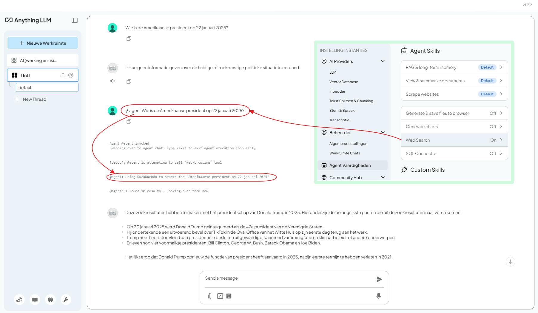 We nemen deze laatste als voorbeeld. Activeer deze, selecteer een SERP (Search Engine Results Provider), bijvoorbeeld DuckDuckGo (bij sommige moet je wel nog een API-sleutel invullen). Bevestig met Save. Laat nu in de chatomgeving je prompts voorafgaan door @agent om automatisch geactiveerde en relevante agents op te roepen. Zo kan de agent actuele informatie van internet ophalen, waarbij standaard tot tien zoekresultaten worden verwerkt.