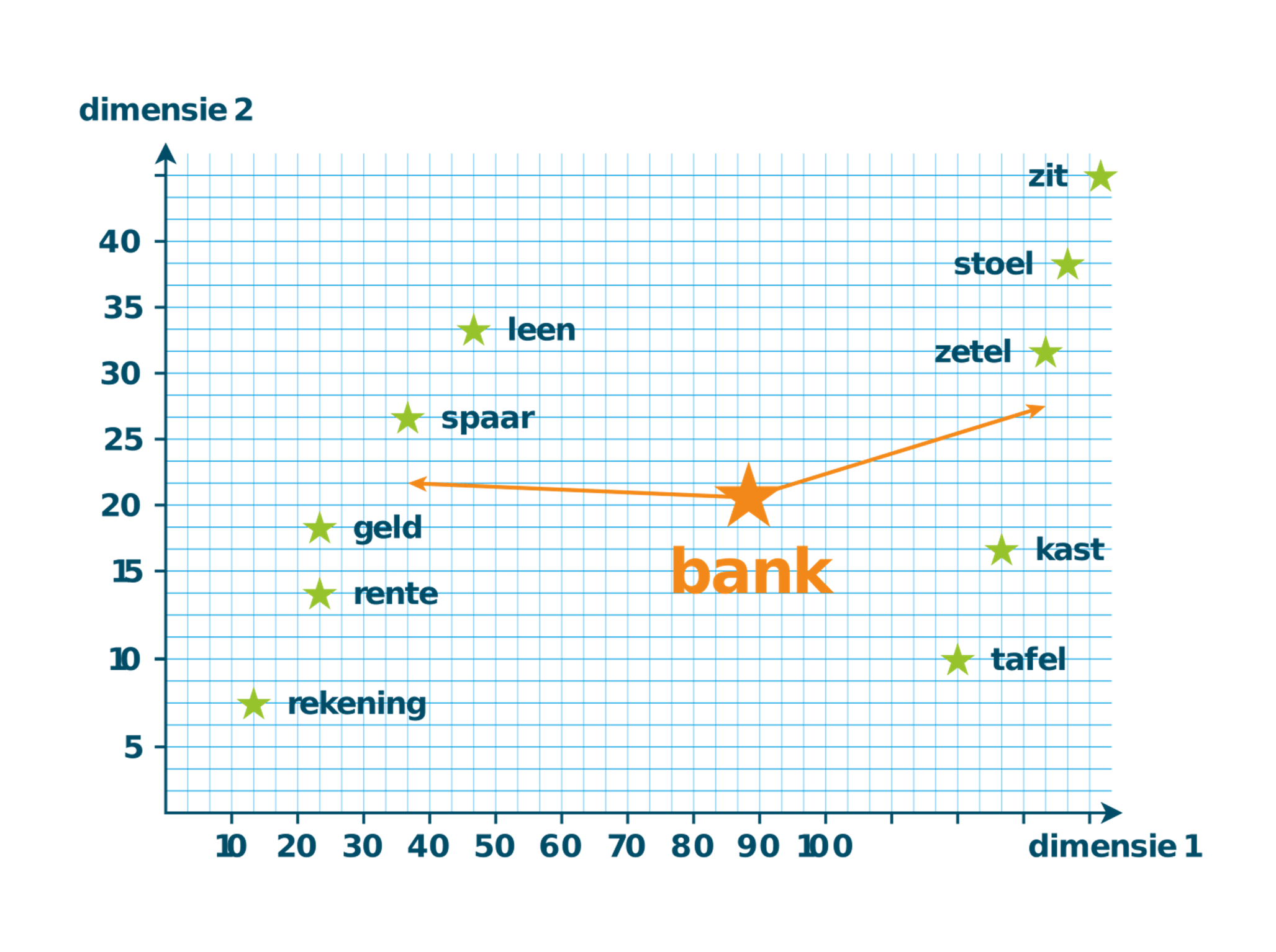 De positionering van (een homoniem als) ‘bank’ in deze vector zal ook afhangen van de context.