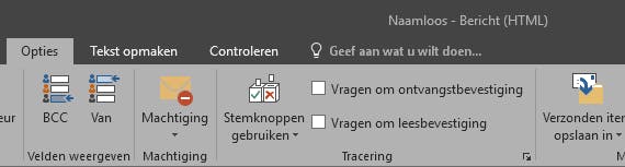 Stemknoppen gebruik je om vrienden of collega’s zonder al te veel gedoe enkele opties voor te leggen. Je stuurt een vraag naar een aantal mensen en Outlook verzamelt de reacties in een overzicht. Nog even vooraf: stemknoppen werken uitsluitend in Outlook. Wanneer je zo’n mail met stemknoppen naar iemand stuurt die met een ander mailprogramma werkt, zal diegene geen stemknoppen zien. Om een mail met stemknoppen op te stellen, navigeer je in een nieuwe e-mail naar het tabblad Opties. In het vak Tracering vind je de knop Stemknoppen gebruiken.