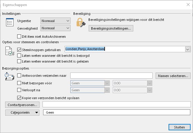 Standaard heb je al de beschikking over een aantal stemknoppen: Goedgekeurd-Afgekeurd, Ja-Nee, Ja-Nee-Misschien, maar je kunt deze opties zelf aanpassen via de knop Aangepast. Laat je respondenten bijvoorbeeld kiezen uit namen van personen of steden. In het dialoogvenster Aangepast vul je de opties in, gescheiden door een puntkomma. Hier kun je ook aangeven of je een melding wilt ontvangen wanneer het bericht bezorgd is en wanneer het bericht gelezen is. Het is zelfs mogelijk de antwoorden ook naar een aantal andere mensen door te sturen.