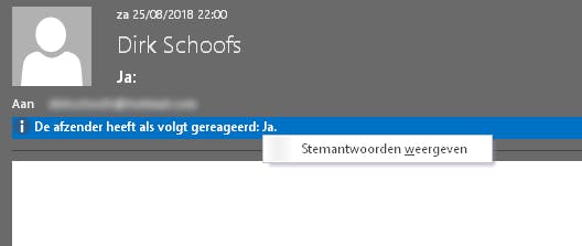 De ontvanger krijgt een melding dat het bericht stemknoppen bevat, met de aanduiding Klik hier om te stemmen. Klikt hij op een van de opties dan heeft hij de keuze: het bericht onmiddellijk verzenden, of het antwoord bewerken voor verzending. Jijzelf, de afzender, ontvangt een e-mail waarin het antwoord al in het onderwerp staat. Je hoeft de mail zelf dus in principe niet eens te openen. Klik op de tekst De afzender heeft als volgt gereageerd, zodat je de Stemantwoorden kunt opvragen. Je ontvangt dan een lijstje met de geadresseerden waarin je meteen ziet wie er wel en niet heeft geantwoord, wat de antwoorden zijn en lees je de totalen van de stemming af.