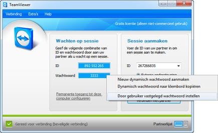 Op het moment dat TeamViewer start, genereert het zelf een nieuw viercijferig wachtwoord. Wanneer u regelmatig verbinding met dezelfde computer maakt, is het erg lastig om steeds het geldende wachtwoord te achterhalen. Een oplossing is het instellen van een vast wachtwoord. Uiteraard moet dit gebeuren op de computer die u wilt benaderen en met toestemming van de eigenaar.