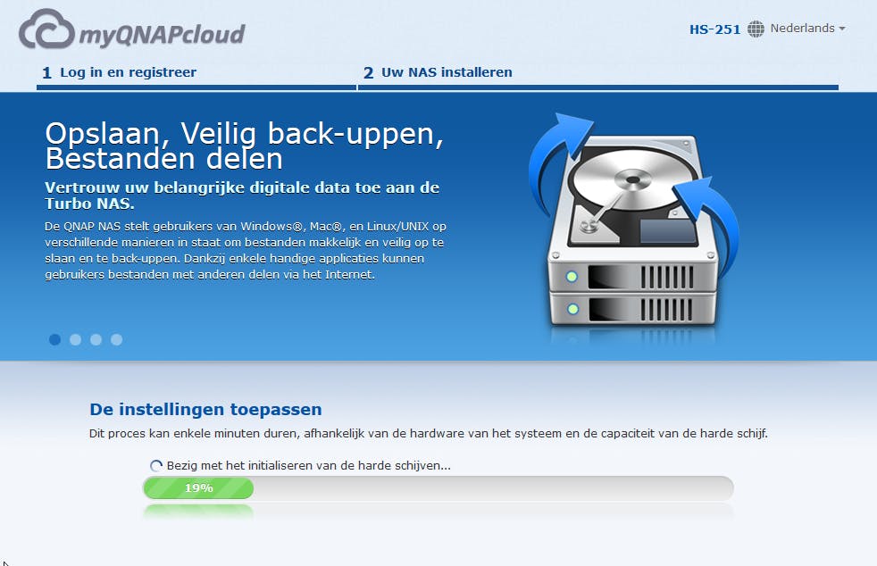De nas wordt ingeschakeld en met behulp van de browser op een pc of mobiel gaan we naar start.qnap.com om ‘m te configureren. Dat doen we door hier eerst aan te geven om welk model nas het gaat en daarna de unieke ‘cloud key’ in te vullen die te vinden is in de handleiding. Hiermee kan de juiste software op afstand op de nas worden gezet, waaronder het op Linux gebaseerde besturingssysteem QTP. Handig daarbij is dat nas ook direct een eigen webadres krijgt, bijvoorbeeld computeridee.myqnapcloud.com. Tijdens dit proces worden ook de schijven geïnitieerd.