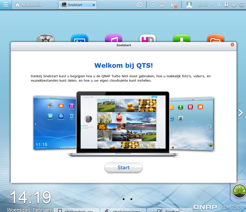 Nadat de installatie is afgerond, kan via de browser direct op de nas worden ingelogd. Het handige Startscherm helpt ons op weg. Dit is ook direct hét moment om het standaardwachtwoord ‘admin’ te veranderen in iets dat veel veiliger is. Dat kan door rechtsboven op de gebruikersnaam te klikken en in het menu te kiezen voor Wachtwoord wijzigen.