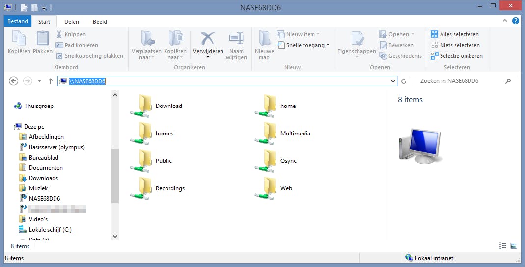 Links bovenin zien we dat deze nas als naam nasE68DD heeft. Wanneer we in de adresbalk van de Windows Verkenner \\nasE68DD typen en op enter drukken, is de kans groot dat we de mappen op de nas direct te zien krijgen. Om toegang te krijgen tot deze mappen, moeten we de gebruikersnaam ‘Admin’ en het wachtwoord (zie stap 4) invoeren. Werkt dit niet of wilt u meer gebruikers aanmaken en rechten voor specifieke mappen instellen? Dat kan door in QTS naar het Configuratiescherm te gaan en te kiezen voor Netwerkdiensten, Win/Mac/NFS en hier te kiezen voor Microsoft Netwerk of Apple Netwerk.