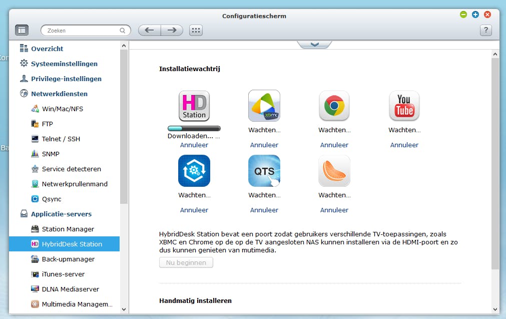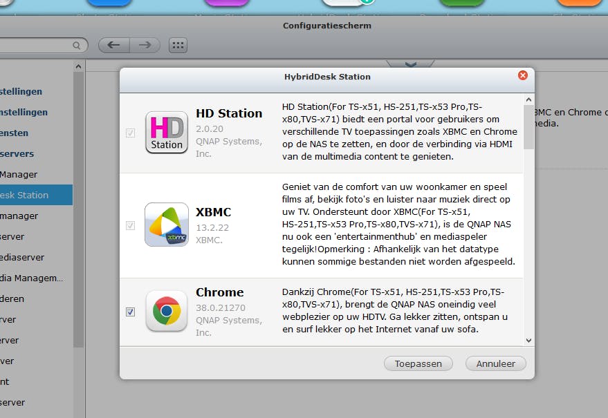 Willen we media ook op de tv kunnen afspelen, dan moet het onderdeel Hybrid Desk (HD) Station op de QNAP worden geïnstalleerd. Dit zorgt ervoor dat multimediatoepassingen zoals bijvoorbeeld Spotify of YouTube gebruik kunnen maken van hdmi. We klikken hiervoor in de web-interface op HD Station en installeren de benodigde onderdelen, waaronder mediacenter XBMC. Druk na de installatie op de knop Inschakelen om de verschillende toepassingen te kunnen gebruiken.