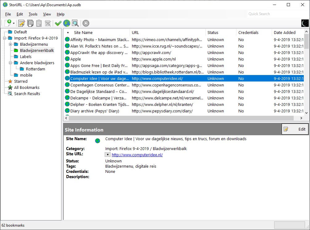Veel mensen gebruiken meerdere browsers naast elkaar en hebben daarin ook allemaal hun eigen lijsten met favorieten. Elk van deze browsers heeft bovendien zo zijn eigen methodes om die te beheren. Er zijn echter tools – zoals StorURL – waarmee u uw lievelingssites in een centrale database kunt bewaren en organiseren. Het programma laat u de favorieten importeren vanuit Chrome, Firefox, Internet Explorer en Opera, en vanuit het programma kunt u ze vervolgens naar wens indelen en openen in uw favoriete browser. U kunt ook inloggegevens beveiligd opslaan en de database met een wachtwoord beveiligen.