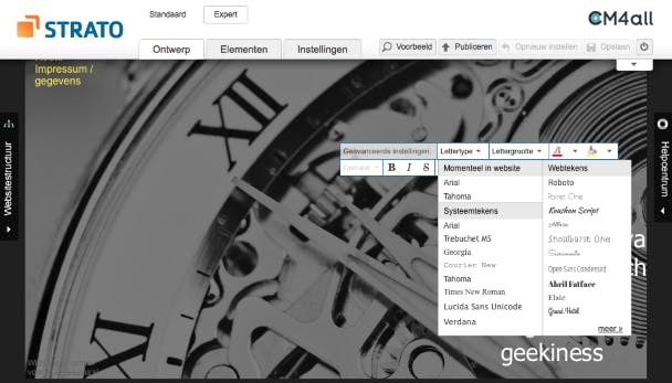 Heb je al ervaring met het bouwen van websites, dan is er ook een expertmodus beschikbaar. Op het eerste gezicht zien beide modi er hetzelfde uit, maar in de expertmodus heb je meer opties voor bijvoorbeeld het lettertype en de kleuren van bepaalde elementen op je site. Aan de hand van je categorie wordt er een bijpassend sjabloon geladen, je verandert menu-items en teksten door er met je muis naartoe te navigeren op het tandwiel naast een tekst te klikken. Ben je klaar met het design, klik dan op Publiceren en bekijk je website in je browser.