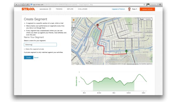 Je kunt ook zelf segmenten maken via Strava.com. Je meldt je aan en bekijkt de details van een eerdere activiteit. Fietsers klikken op Actions / New Segment. Hardlopers vinden deze optie onder het pictogram van de steeksleutel. Gebruik vervolgens de schuifbalk boven de kaart om het begin- en eindpunt van het segment in te stellen. Met de knoppen eronder kun je de punten nog preciezer afstellen.