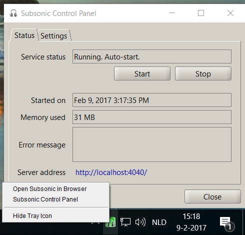 Subsonic gebruikt Java, waardoor het op bijna elk platform draait. Kies het platform waarmee je aan de slag gaat. Voor Windows download je het exe-bestand en voer je het uit. Als je geen Java hebt geïnstalleerd, verschijnt er een melding en installeer je dat eerst via een wizard. Terug in de installatie van Subsonic klik je op Next / Install / Finish. Je ziet dat rechtsonder Subsonic in het systeemvak actief is. Klik erop met de rechtermuisknop en kies voor Open Subsonic in Browser om aan de slag te gaan.