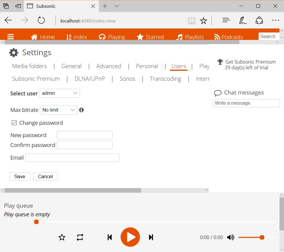 Via de menuknop Instellingen kun je Subsonic naar wens instellen, bijvoorbeeld de taal of het thema aanpassen. Ook kun je sociale instellingen wijzigen, zoals aan anderen in Subsonic laten zien waar je naar luistert, al dan niet weergeven van chatberichten en het automatisch weergeven van de wachtrij als je daar onderaan met je muis overheen gaat.