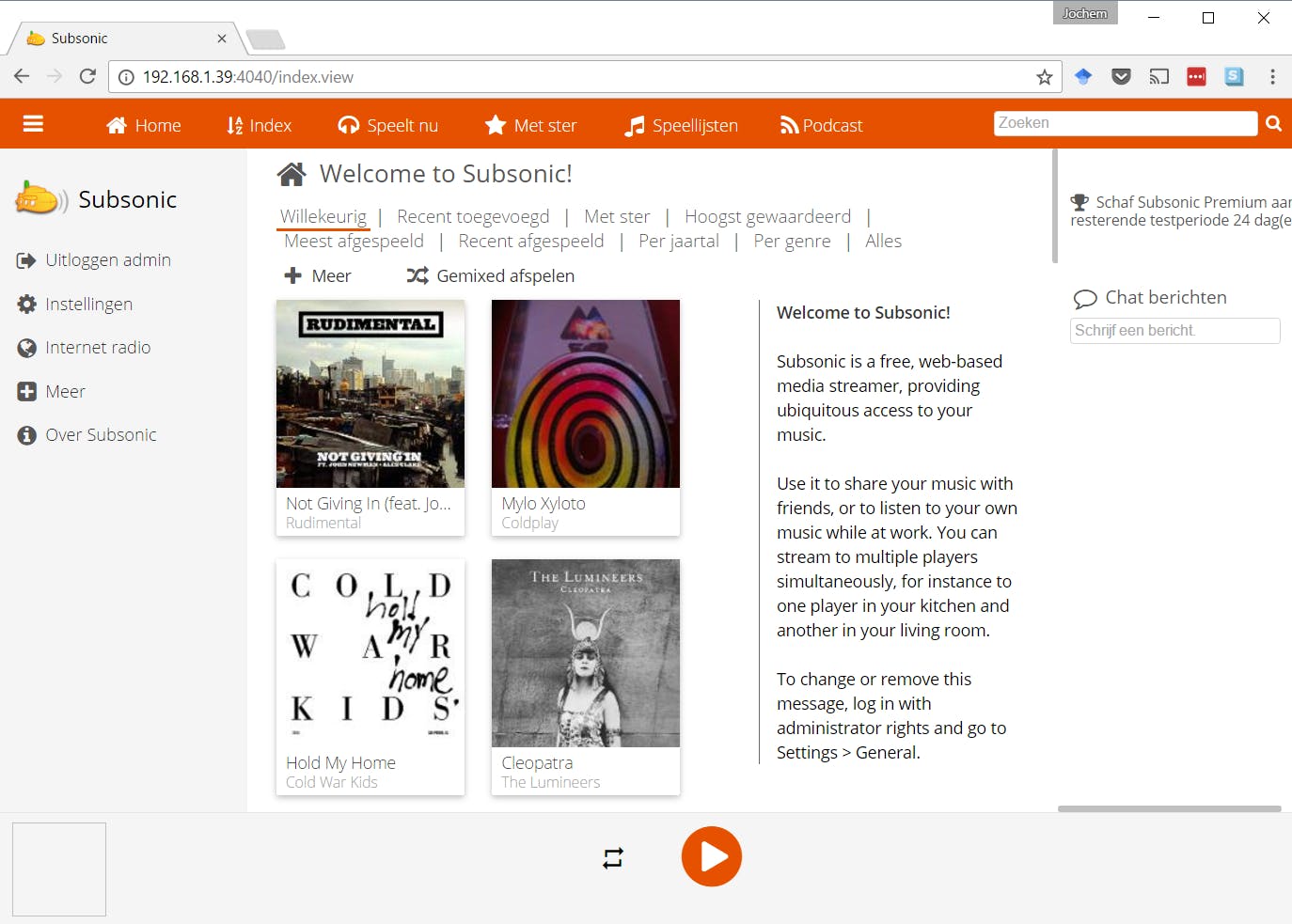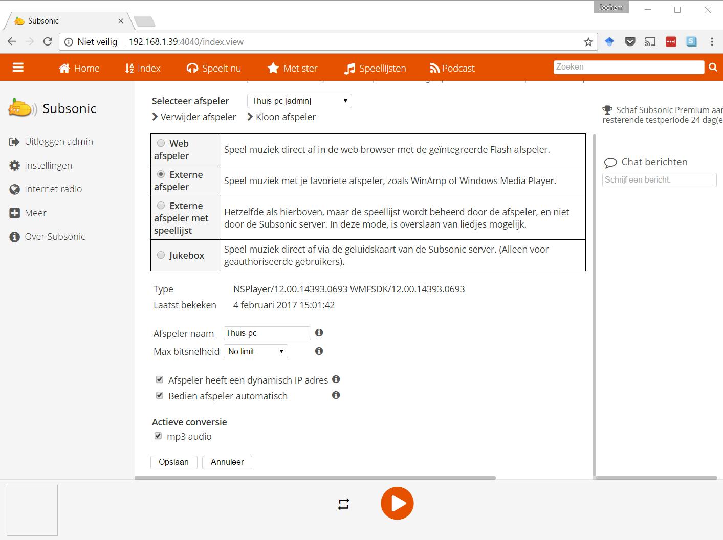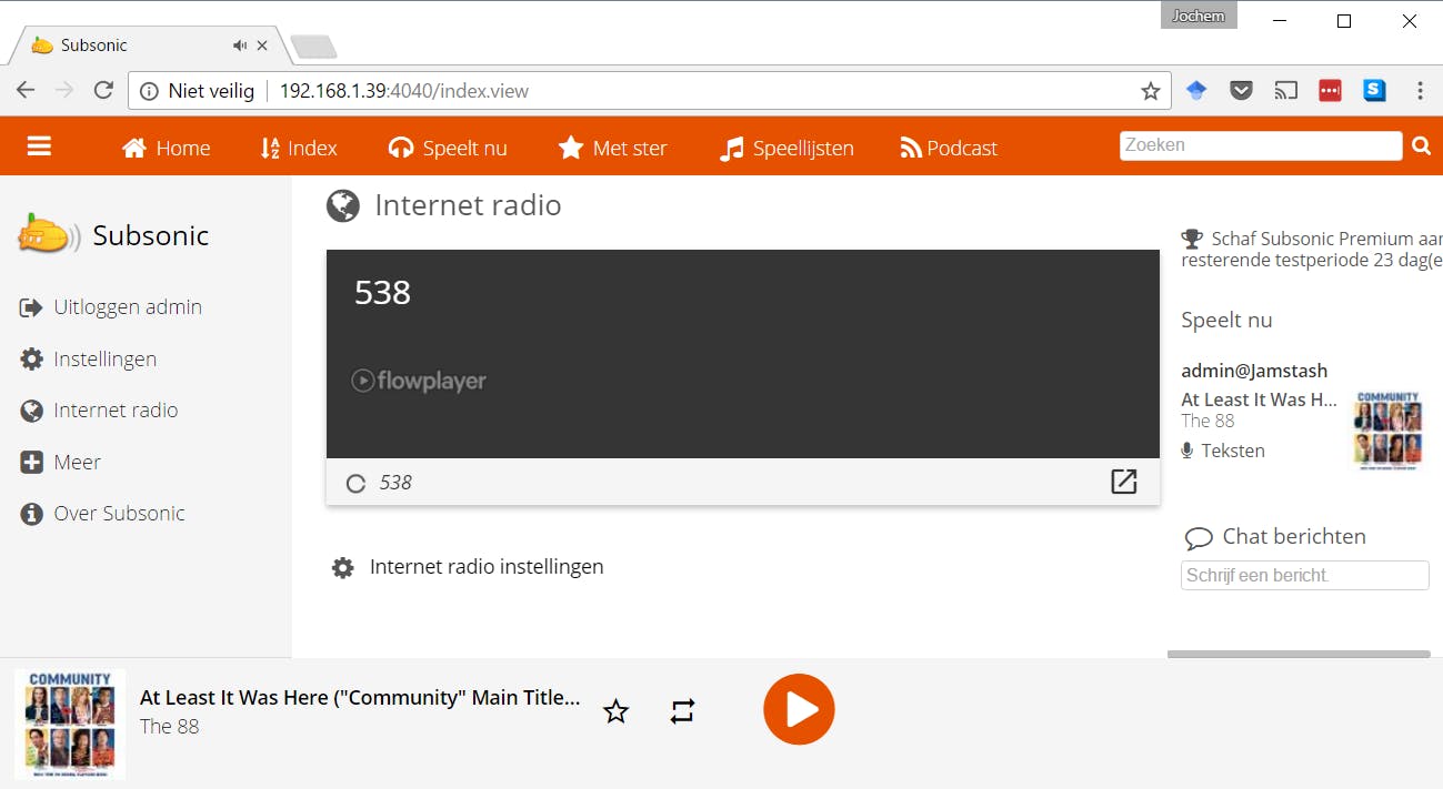 Handig is dat je met het de menuknop links naar Internet radio kunt gaan en zo radiostations kunt toevoegen vanaf het internet. Als je op het internet zoekt, kun je van veel radiostations de Shoutcast- of Icecast-link vinden. Dat is de url van de stream van het radiostation, die je dan hier kunt toevoegen. Nadat je deze toegevoegd hebt, vernieuw je de pagina en kun je het radiostation afspelen in Subsonic.