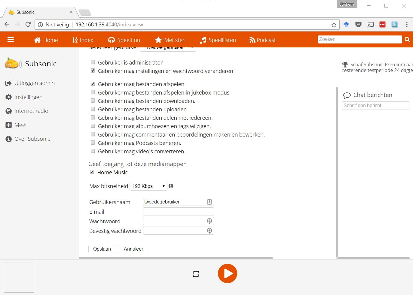 Bij Gebruikers kun je anderen toevoegen, zodat ze mee kunnen luisteren met je muziekcollectie. Je kunt met de selectievakjes kiezen wat een gebruiker mag, zoals bestanden downloaden of uploaden, bestanden delen, tags wijzigen en podcasts beheren. Handig is dat je kunt kiezen tot welke mappen zij toegang hebben met de optie Geef toegang tot deze mediamappen. Onderaan vul je de gebruikersnaam, e-mailadres en wachtwoord in van degene die je wilt toevoegen. Klik op Opslaan om de gebruiker toe te voegen.