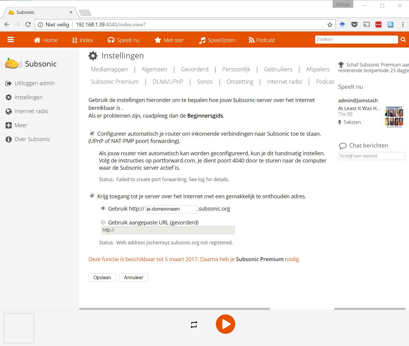 Een aantal functies van Subsonic is alleen beschikbaar na betaling. Als je de apps wilt gebruiken op iOS, Android of desktopapps, dan heb je een abonnement nodig. Hetzelfde geldt om te casten naar Chromecast en naar Sonos-apparaten en ook als je een DLNA/UPnP-server op wilt zetten. Met de premiumvariant is het mogelijk om een eigen subdomeinnaam te krijgen, zodat je altijd makkelijk bij je server kunt, maar je kunt hetzelfde bereiken met een eigen domeinnaam. De premiumvariant heeft een webinterface zonder advertenties en je kunt je vanuit Subsonic abonneren op podcasts. De premiumversie is dertig dagen gratis te proberen. Een abonnement kost een dollar per maand, maar je kunt ook abonnementen kopen voor 1 t/m 8 jaar. Er is zelfs een levenslange licentie voor 99 dollar. Die heeft dus alleen zin als je Subsonic langer dan 8 jaar denkt te gaan gebruiken. Maar of de software dan überhaupt nog bestaat én je voorkeur heeft is zeer de vraag …