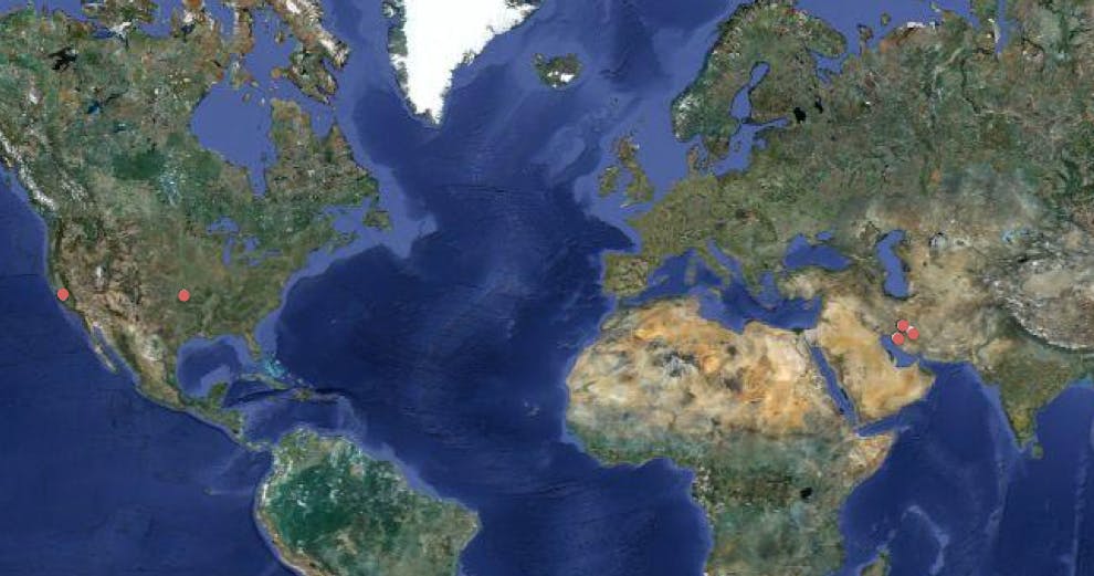 McAfee heeft een eerste besmettingsgolf van Flame in kaart gebracht. Daarbij zijn twee locaties in de Verenigde Staten en drie in de Arabische Emiraten zichtbaar: