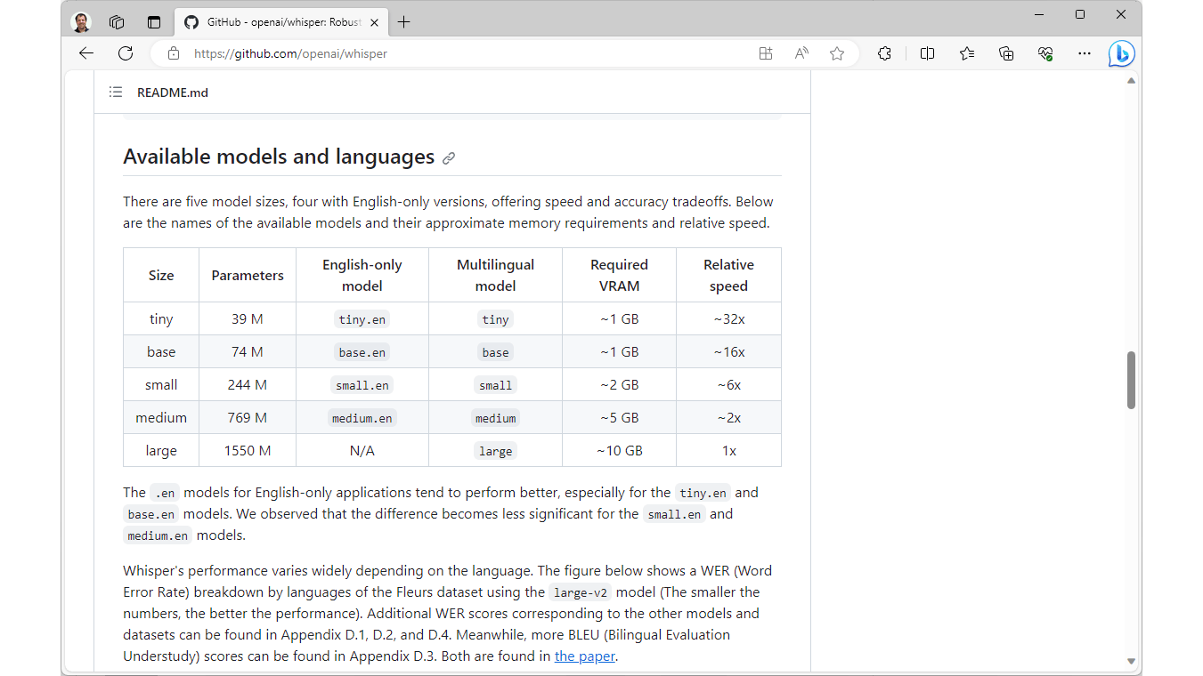 Je kunt bij het werken met Whisper uit verschillende modellen kiezen, oplopend in omvang. De meertalige modellen heten achtereenvolgens tiny, base, small, medium en large. Als je Whisper gebruikt, moet je één van deze modellen kiezen. Er zijn ook modellen voor alleen het Engels. Deze heten tiny.en, base.en, small.en en medium.en. Hoewel je voor Engels ook gewoon de meertalige modellen kunt gebruiken, zijn deze specifieke Engelstalige modellen wat nauwkeuriger, al merk je dat vooral bij de kleinere modellen tiny.en en base.en. We kiezen in dit artikel steeds voor het medium-model, met voor Engels de .en-versie. Probeer en vergelijk zeker de kleinere modellen als je een minder zwaar systeem of minder tijd hebt.
