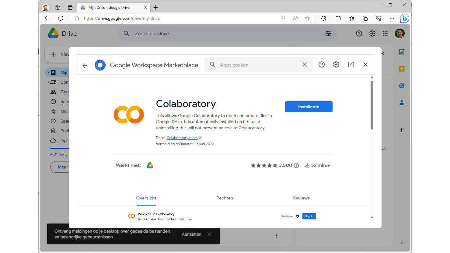 We beginnen in Google Drive waar je Colab als app kunt koppelen. Kies daarvoor Nieuw / Meer / Meer apps koppelen. Vul in het zoekveld Google Colaboratory in. Klik op de bewuste app en kies dan Installeren. Na het doorlopen van de stappen is Google Colaboratory gekoppeld aan je Google Drive en kun je het venster sluiten.