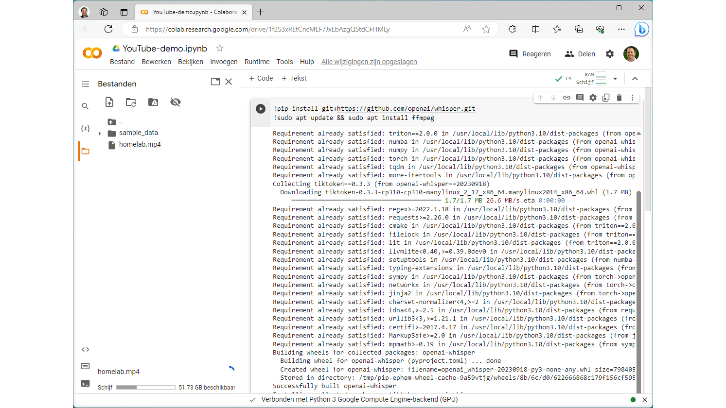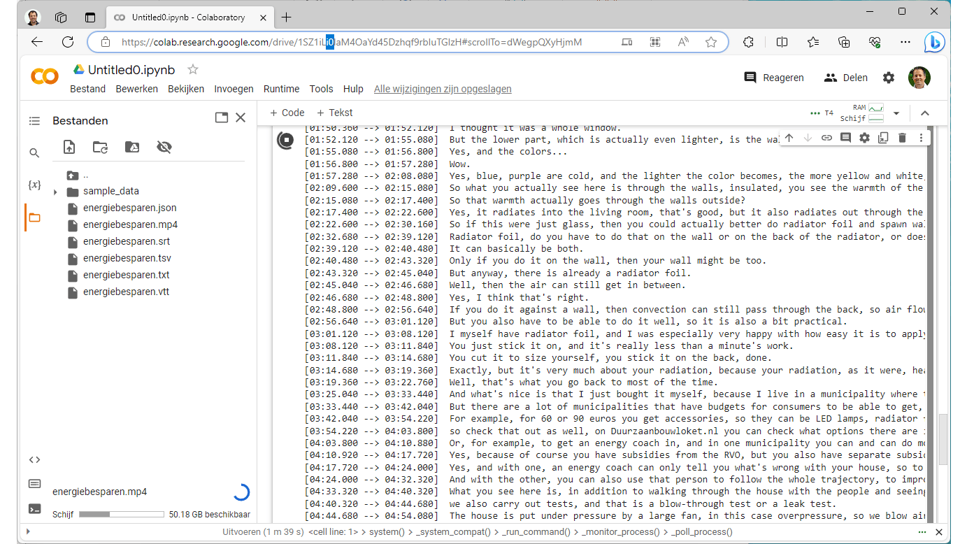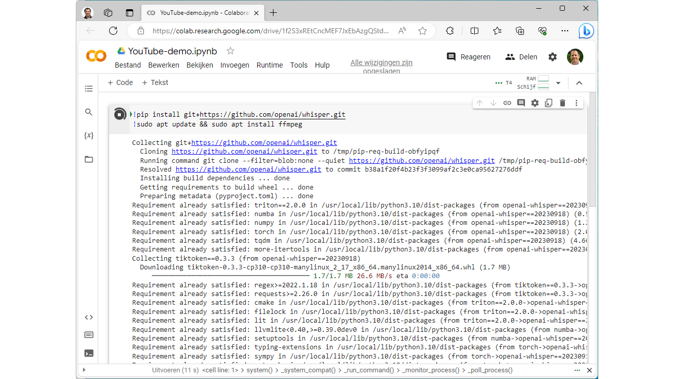 Nadat de app is gekoppeld kun je onder Nieuw / Meer direct Google Colaboratory openen. Linksboven kun je de naam van het project (Untitled0.jpynb) veranderen. We maken hier YouTube-demo.jpynb van. Kies in het menu Runtime voor Runtimetype wijzigen. Selecteer onder Hardwareversnelling een gpu. De beschikbaarheid kan variëren. In dit voorbeeld kiezen we T4 GPU. Klik dan op Opslaan. De grafische kracht zal automatisch in ons project worden benut. Plak de onderstaande opdrachten in het tekstvak achter het uitvoerenicoontje en voer het uit. Daarmee worden Whisper en FFmpeg geïnstalleerd. Dit framework zorgt ervoor dat alle denkbare mediabestanden kunnen worden gedecodeerd: