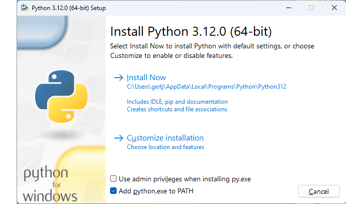 Een lokale installatie onder Windows is zeker niet lastig, maar er is best wat software vereist om alles te laten werken. Om te beginnen moet je Python downloaden en installeren. Hoewel een wat oudere versie wordt aangeraden, zijn we geen problemen tegengekomen bij gebruik van de meest recente versie 3.12.0. Let er bij de installatie van Python op dat je een vinkje zet bij Add python.exe to PATH. Je kunt Python dan vanuit elke map op de pc aanroepen. Installeer vervolgens ook Git voor Windows. Bij deze installatie kun je alle standaardopties accepteren. Belangrijk is dat Git daarbij ook weer aan het path wordt toegevoegd.