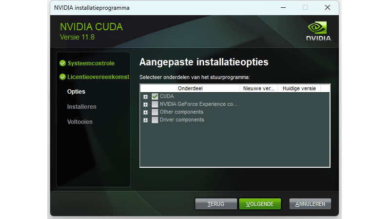 Heb je een grafische kaart van Nvidia, dan kun je de berekeningen van Whisper flink versnellen, zoals we verderop zullen laten zien. Hiervoor dien je CUDA te installeren. We gebruiken versie 11.8. Selecteer op de downloadpagina Windows met de architectuur x86_64 en selecteer je versie van Windows (doorgaans 10 of 11). De hier gekozen versie van CUDA wordt ook door PyTorch ondersteund, dat we in de volgende stap gaan installeren. Doorloop de installatie. Kies daarbij in het venster Installatieopties voor Aangepast (geavanceerd). Vink vervolgens alle onderdelen uit behalve CUDA. Zo voorkom je dat onder andere de huidige drivers voor je grafische kaart worden vervangen door een oudere versie.