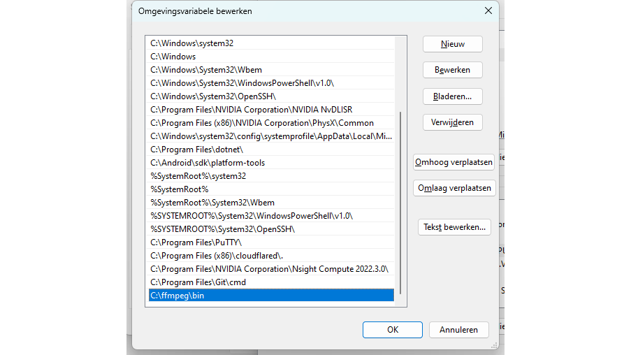 Je hebt voor een lokale installatie ook het framework FFmpeg nodig. Klik op de downloadpagina op het Windows-icoontje en kies Windows builds from gyan.dev. Download het archief (ffmpeg-git-full.7z) en pak het uit met de ingebakken tool van Windows of bijvoorbeeld 7-Zip. Hernoem de map naar ffmpeg en verplaats deze naar de C-schijf. Het bestand ffmpeg.exe bevindt zich dan in C:\ffmpeg\bin. Deze map gaan we aan het path toevoegen. Druk op Windows-toets+R, vul in sysdm.cpl en druk op Enter. Open dan het tabblad Geavanceerd en kies Omgevingsvariabelen. Dubbelklik op Path. In het venster klik je op Nieuw om een pad toe te voegen. Vul dan in: C:\ffmpeg\bin. Bewaar de aanpassingen en herstart je systeem.